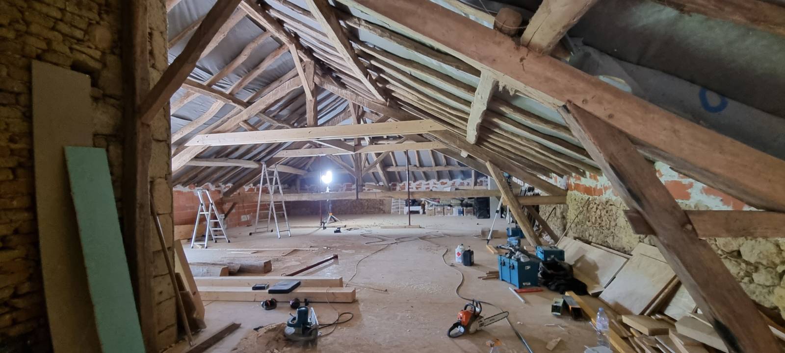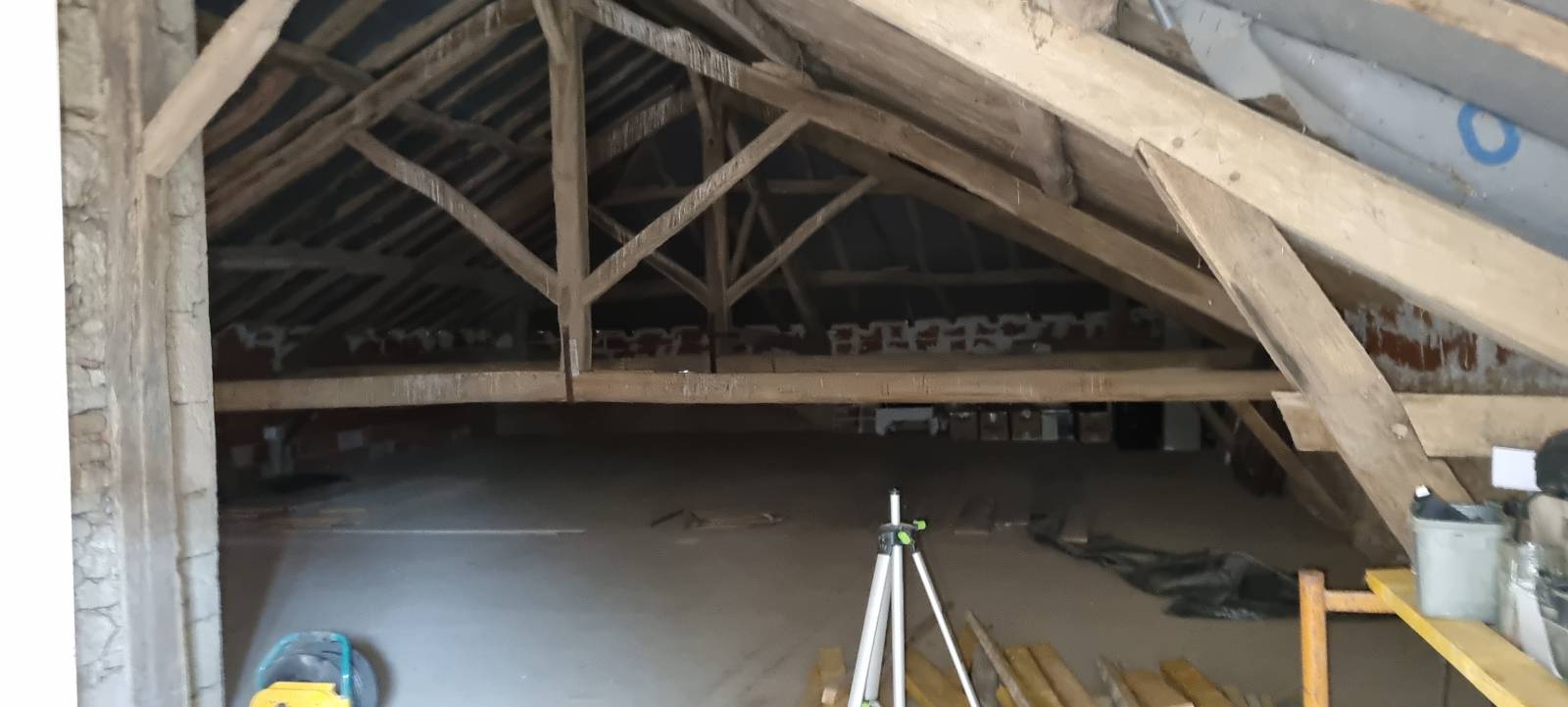 Une fois le tout sécurisé, nous avons pu procéder à la modification de la charpente traditionnelle, pour la modifié en ferme sur blochets. Procédé de charpente traditionnelle qui permet, avec ce concept de ferme dit sur blochets de crée des combles aménageables.